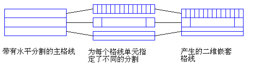 上图显示了格线中具有同一单元指定(即垂直分割)的所有单元。但是,格线中的每个单元都是独立的,且可以有单独的指定。例如,下面的插图显示了具有三个单元的水平格线,每个单元都有不同的指定。底部单元包含另一水平分割,中部单元包含可变宽度的垂直分割,而顶部单元包含固定宽度的垂直分割。