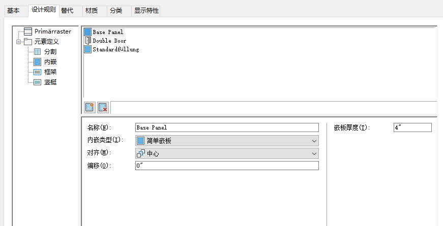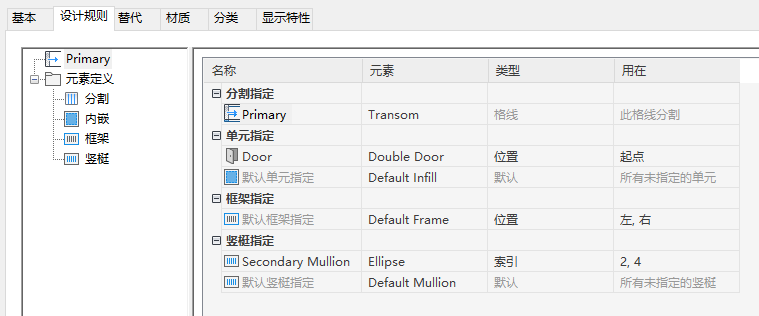 可以使用“门窗组合样式特性”对话框中的“设计规则”选项卡修改元素定义。可以从指定列表和定义列表中访问这些定义: