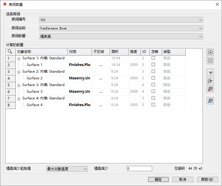 选择计算的房间土方量:墙表面、楼板表面、天花板表面、房间周长和家具对象。根据选定的房间土方量,计算的对象和值将在表中列出。将为每个房间(空间)单独列出房间土方量。