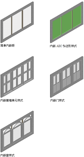 内嵌定义门窗组合单元的内容。门窗组合单元可以使用默认的简单板,也可以包含嵌套格线、AEC 多边形、幕墙单元、门或窗样式。用于内嵌的对象样式必须位于当前图形中,这样才能添加到内嵌定义中。嵌板通常代表玻璃板或其他普通覆面,如石板或混凝土板。