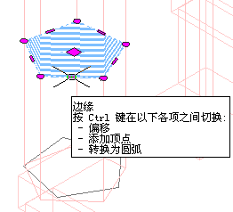 | 使用夹点编辑轮廓 | 根据需要移动边或顶点。 “边缘”夹点有三种编辑模式:偏移、添加顶点、转换为圆弧。 默认模式是“偏移”,该模式可将选定边沿着与该边中点垂直的方向进行偏移。根据轮廓的造型和选择要编辑的边,将视情况延伸或修剪相邻线,并添加新线。 使用“添加顶点”编辑模式可以向选定边添加顶点,并创建新边。如果选定边是圆弧,则新建边也将是一个圆弧。 “转换为边”模式可将选定边修改为圆弧,并拉伸边的中点。圆弧的边夹点也有“拉伸”模式,使您可在将边转换为圆弧之后拉伸该边的中点。 |