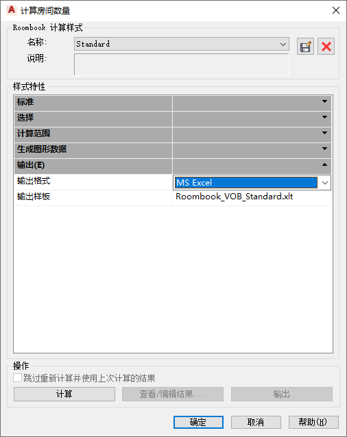2. 在“计算房间土方量”对话框中,在“样式特性”的“输出”列表下,在“输出格式”列表中选择“MS Excel”。