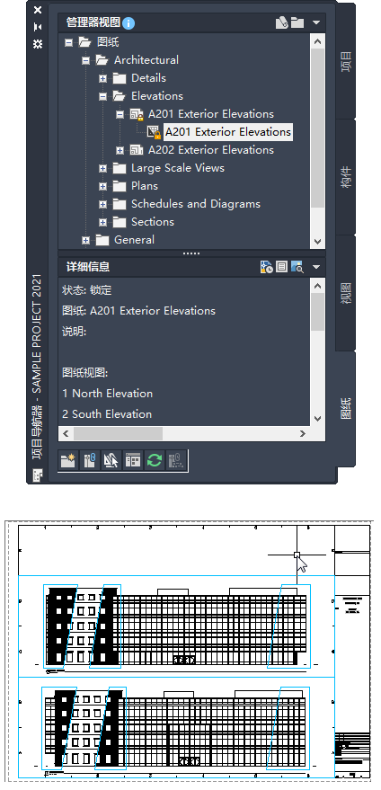 图纸集、图纸、图纸视图、图纸图形和模型空间视图都在“项目导航器”的“图纸”和“视图”选项卡上列出。