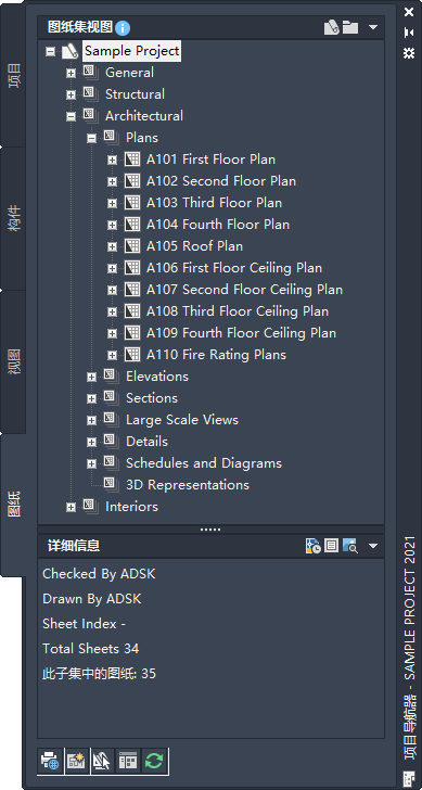 AutoCAD Architecture 2027 工具集 中的每个项目都有一个简单的项目图纸集,其中包含项目的所有图纸。