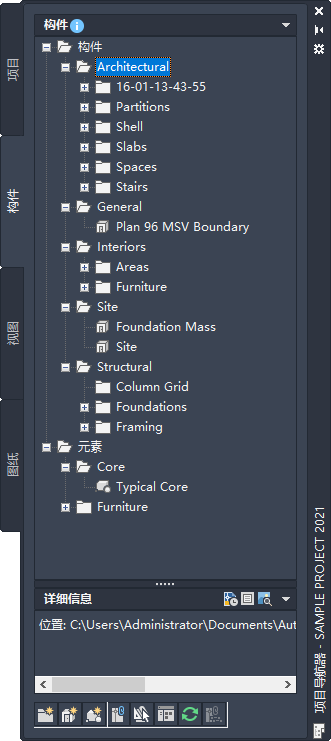 构件可以包含图形对象(如墙和门)、到元素的外部参照或者是两者的组合。例如,第一层核心构件可以包含直接绘制到构件中的核心墙和作为外部参照插入的电梯元素。