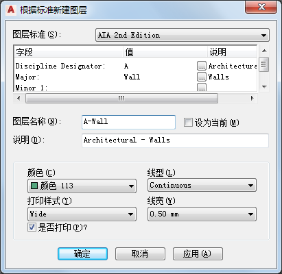 完成上述操作后,“图层名称”和“说明”字段会显示选定值的组合。例如,如果已经根据 BS1192 图层标准为存储架创建了新的图层,其名称为 A746G。