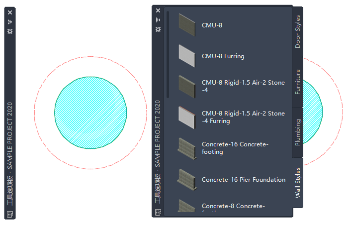 隐藏的工具选项板集(左侧)和重新显示的工具选项板集(右侧)