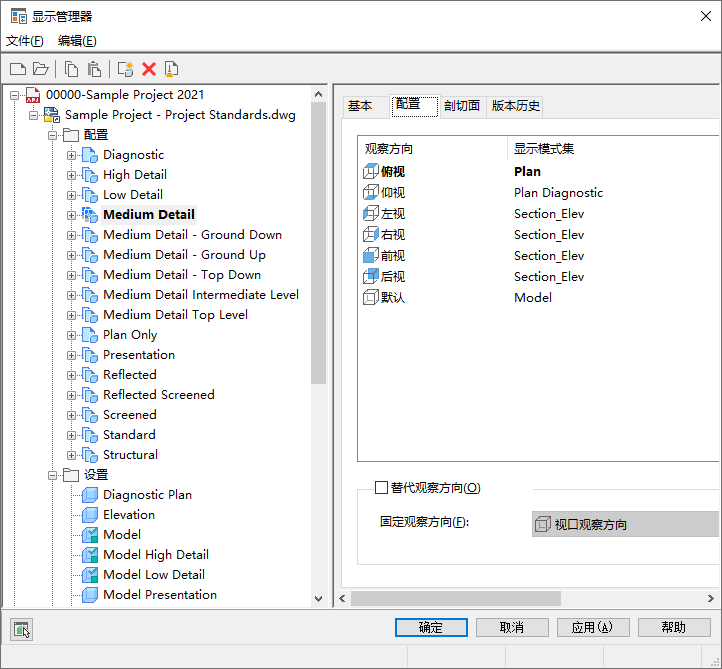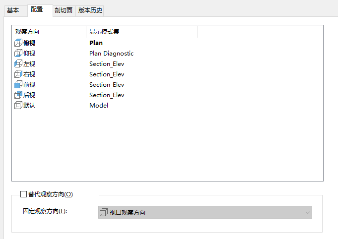 在下列样例中,“模型”显示集应用于默认的视图方向。右窗格显示,“Section_Elev”显示集已应用于前视图、后视图、左视图和右视图方向。“平面”显示集应用于俯视图方向。在右窗格中,图标对应六个正交视图方向以及默认的视图方向。