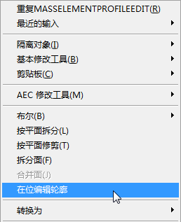 指定给图形中对象的轮廓可以用于在位编辑,这样便可在屏幕上修改轮廓的造型,进而修改构件。在位编辑模式是一种特殊的编辑模式,可在其中编辑对象构件,但是其他编辑功能受到限制。例如,当处于在位编辑模式下时,不能保存和关闭图形。退出在位编辑模式时,可以选择是否应放弃修改、覆盖现有轮廓定义,或者是否应创建新轮廓定义。