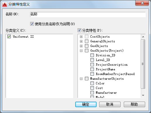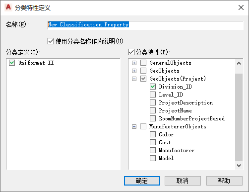 屏幕上将显示“分类特性定义”对话框。左窗格会列出应用于当前特性集定义的对象样式的分类定义。例如,如果当前特性集定义适用于门样式,则“分类”窗格会列出适用于门样式的所有分类定义。