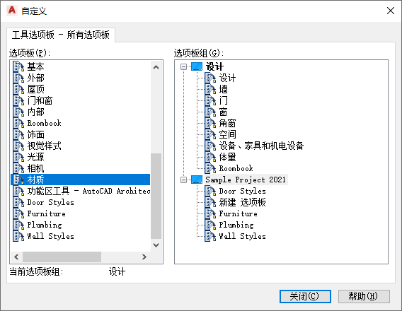 左侧将列出所有可用选项板。右侧将列出所有选项板组。空的项目工具选项板组也会在右侧列出。