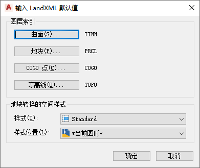 如果您没有为 LandXML 数据定义特定的图层索引,所输入的数据将放在为 LandXML 数据、TINN(曲面)、PRCL(地块)、COGO(COGO 点)和 TOPO(等高线)指定的默认图层索引上。