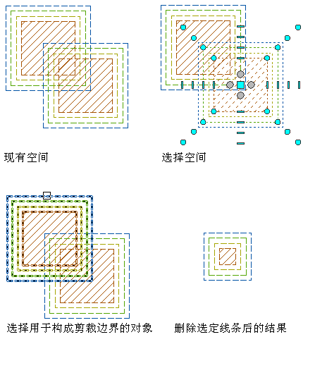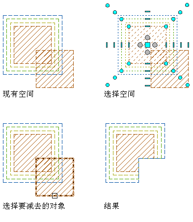 从另一个空间减去空间时,所减去空间的边界将会从第一个空间的所有边界减除。所减去空间的其他边界将会直接删除,而不会与第一个空间相交。根据第一个空间是具有样式定义的偏移还是手动偏移,孔周围的边界将根据样式偏移重新计算,或者在相交处切割。