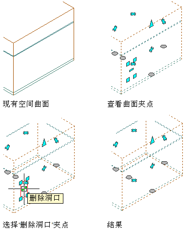 1. 选择要删除其曲面洞口的空间,并按下列方式之一显示曲面洞口的夹点: