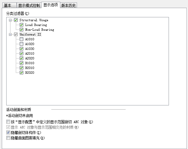 例如,若要隐藏分类为 A1010 和 A1020 的所有门和墙,请在“统一格式 II”下面清除 A1010 和 A1020 的相应复选框。
