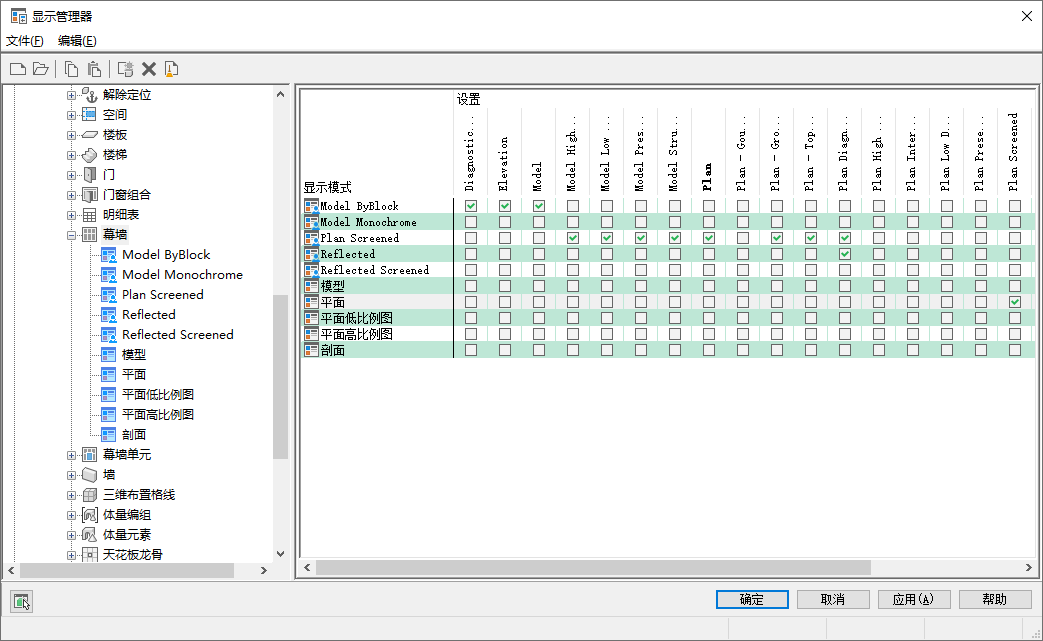 在右窗格中,行列出该对象的显示模式,列则列出显示集。显示集下方的勾选标记表示在该显示集中使用此显示模式。同一显示模式可用于多个显示集中。