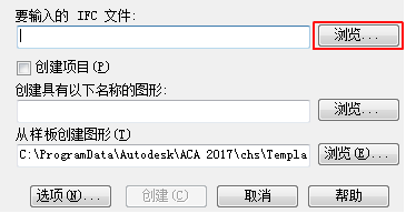 在“输入 IFC 文件并创建图形”对话框中,在“要输入的 IFC 文件”下,单击“浏览”。