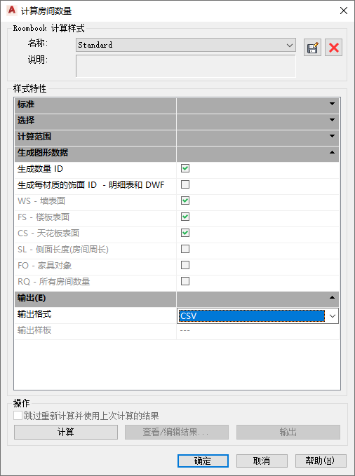 启动输出过程。CSV 输出将为每个房间土方量类别生成一个文件。每个文件都将以图形的名称和 Roombook 计算类型的名称作为前缀。