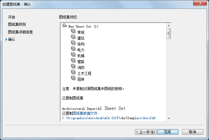 | 完成图纸集样板的创建 | 单击“完成”。 |
