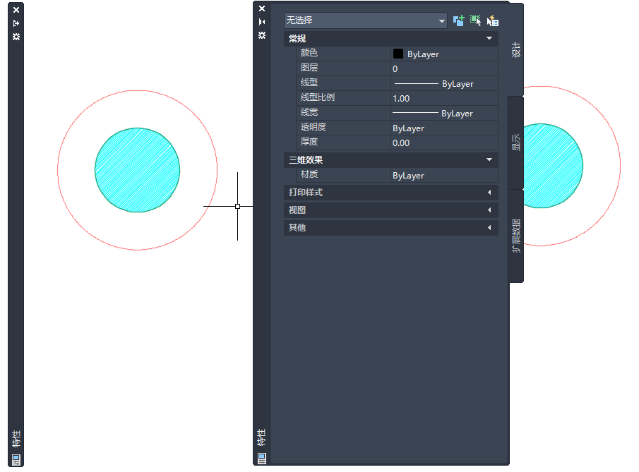 隐藏的“特性”选项板(左侧)和重新显示的“特性”选项板(右侧)