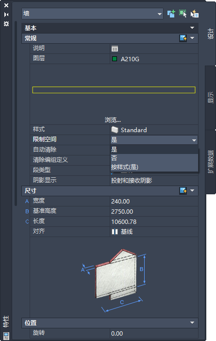 - 在“特性”选项板中,在下列位置之一显示“限制空间”设置。