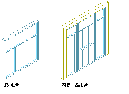 窗组合起着与幕墙单元相似的作用,但可以包含内嵌板或者对象(如门或窗)。门窗组合可以插入到幕墙和标准墙中。