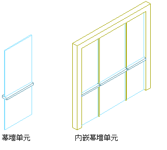可插入到格线中的其他对象有幕墙单元和门窗组合。幕墙单元经过设计,可以表示主幕墙中重复出现的复杂元素。