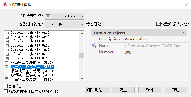 查看附着特性集的对象或样式列表 将对象过滤器应用于特性集。左窗格中列出特性集所附着至的对象或样式。如果选择了“亮显”,附着(直接附着或通过样式附着)特性集的任何对象在图形中会亮显。