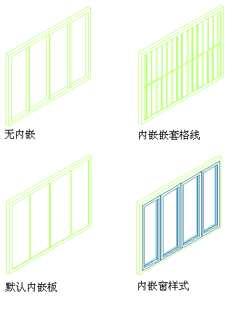 内嵌定义门窗组合单元的内容。门窗组合单元可以使用默认的简单板,也可以包含嵌套格线、AEC 多边形、幕墙单元、门或窗样式。用于内嵌的对象样式必须位于当前图形中,这样才能添加到内嵌定义中。嵌板通常代表玻璃板或其他普通覆面,如石板或混凝土板。