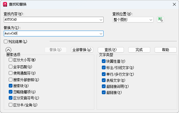 指定是搜索整个图形、当前布局还是搜索当前选定的对象。如果已选择一个对象,则默认值为“所选对象”。如果未选择对象,则默认值为“整个图形”。可以用“选择对象”按钮临时关闭该对话框,并创建或修改选择集。