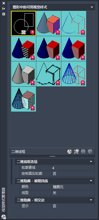 “视觉样式管理器”包含图形中可用的视觉样式的样例图像面板和以下特性面板: