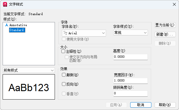 注: 如果更改现有文字样式的方向或字体文件,当图形重生成时所有具有该样式的文字对象都将使用新值。