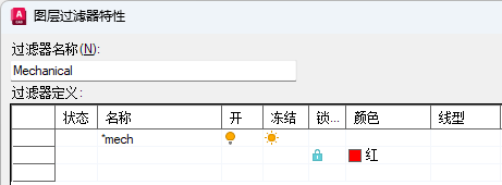 如果在图层特性管理器的“过滤器”面板中选择一个图层过滤器,则图层列表中仅显示与该过滤器中指定的特性相匹配的图层。过滤图层可以将较长的图层列表减少到仅为当前相关的图层。