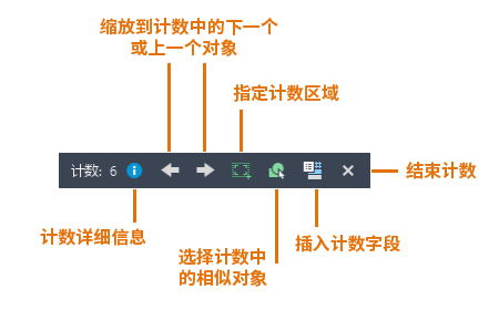 指定对象的所有实例都将亮显,并且计数结果将显示在“计数”工具栏上。该工具栏提供的若干命令和选项可用于查看和管理计数中的对象。