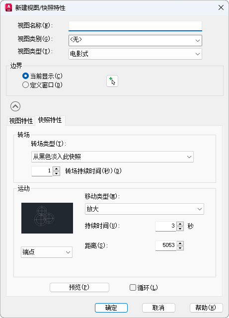 在将命名视图指定为电影式视图类型后,设置运动要完成的距离。