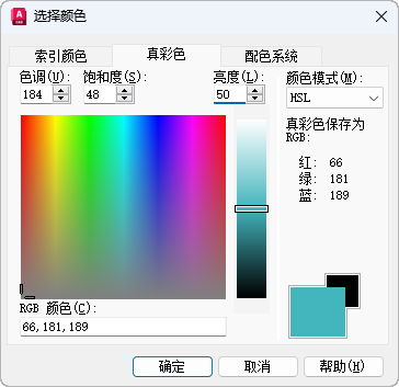 使用真彩色(24 位颜色)指定颜色设置(使用色调、饱和度和亮度 [HSL] 颜色模式或红、绿、蓝 [RGB] 颜色模式)。使用真彩色功能时,可以使用一千六百多万种颜色。“真彩色”选项卡上的可用选项取决于指定的颜色模式(HSL 或 RGB)。
