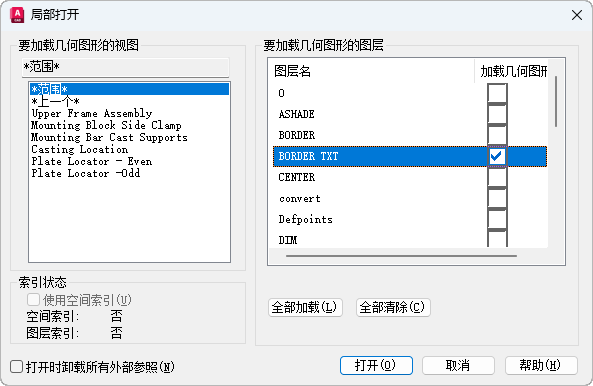 可以从视图(或选定区域)和图层中选择并加载几何图形。不能卸载图形中当前加载的任何信息。如果图形包含附着的外部参照,但局部打开图形时没有加载,则可使用“外部参照”选项板重新加载外部参照。请参见外部参照。