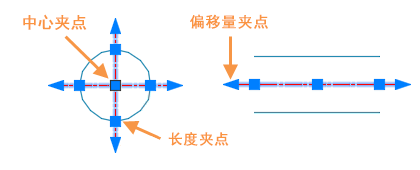 夹点可用于直接对中心标记和中心线执行操作。在此示例中,单独修改圆上的中心线。当您拖动长度夹点时,它将调整中心线的长度,并且中心线延伸将随之移动。但拖动外偏移量夹点时,仅控制中心线延伸。