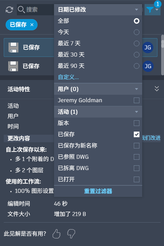 通过在活动过滤器中选择“已保存”,可以隔离版本活动。要进一步过滤,请使用“时间”和“用户”过滤器。