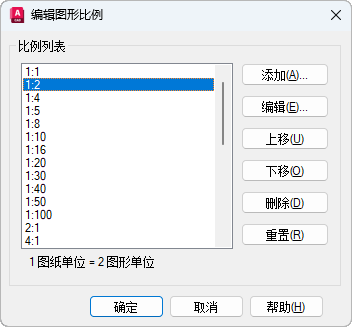 删除所有自定义比例和未使用的比例,并恢复“默认比例列表”对话框中定义的默认比例列表。