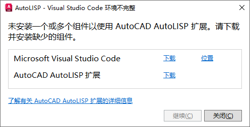 如果已安装 Visual Studio Code 但未安装 AutoCAD AutoLISP Extension,则 AutoCAD 将在启动 Visual Studio Code 之前下载并安装 AutoCAD AutoLISP Extension。