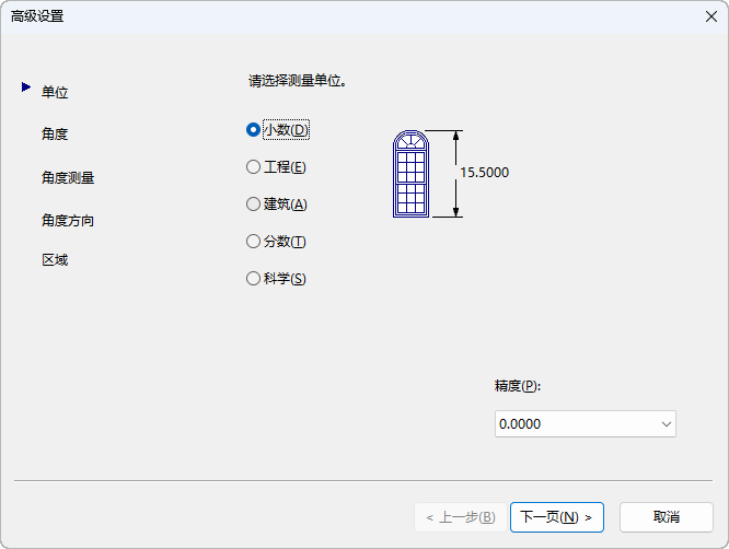 “高级设置”向导包含无页:“单位”、“角度”、“角度测量”、“角度方向”和“区域”。使用此向导时,可以选择“上一步”和“下一步”在对话框之间切换;选择最后一页上的“完成”可关闭向导,并以指定的设置创建新图形。
