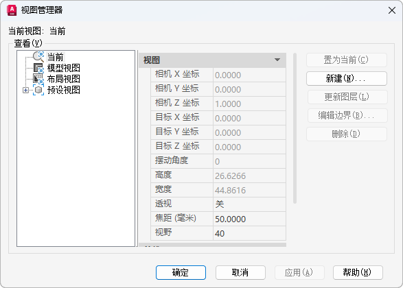 显示“新建视图/快照特性”对话框或“新建视图”对话框。