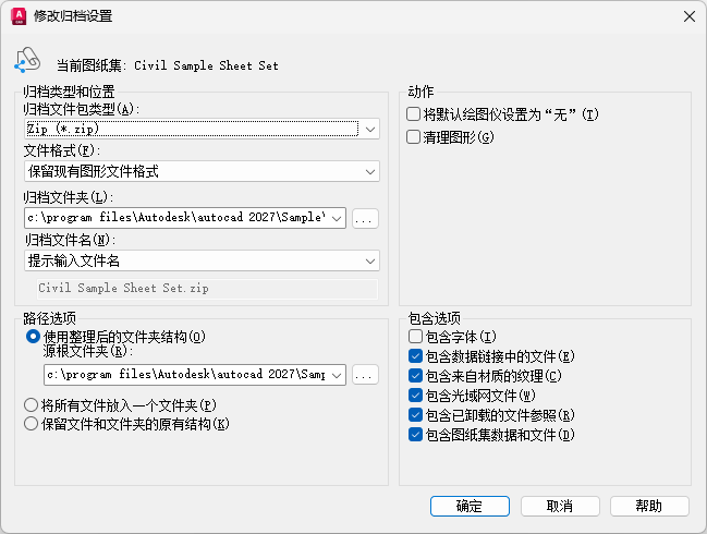 更改归档的图纸集文件包的路径、默认格式、组织和其他设置。