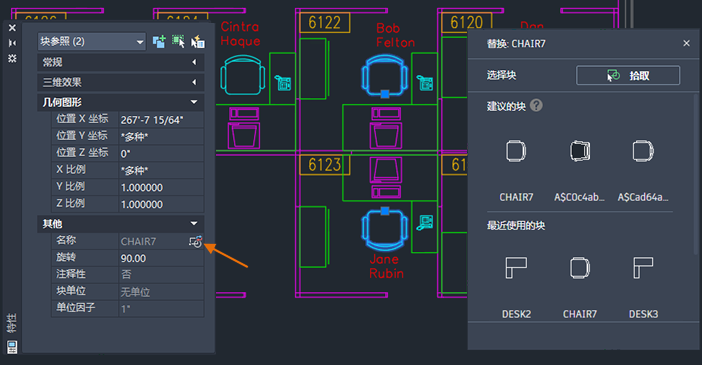 选择要替换的块参照时,产品会为您提供从中选择的类似建议块。还可以将选定块替换为从图形、最近插入的块列表或创建的块列表中指定的其他块。替换的块参照会保留原始块的比例、旋转和属性值。