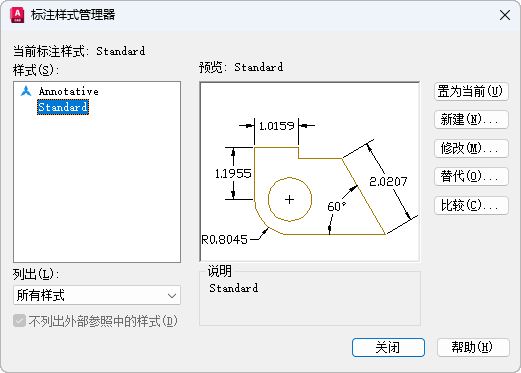 显示当前标注样式的名称。默认标注样式为标准。当前样式将应用于所创建的标注。