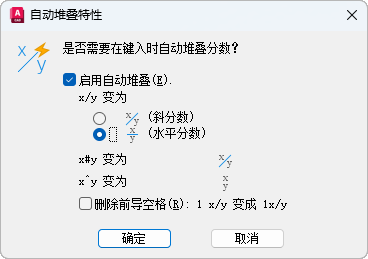 MTEXT(命令) 查找:在“在位文字编辑器”中选择堆叠分数 > > “堆叠特性” > “自动堆叠”