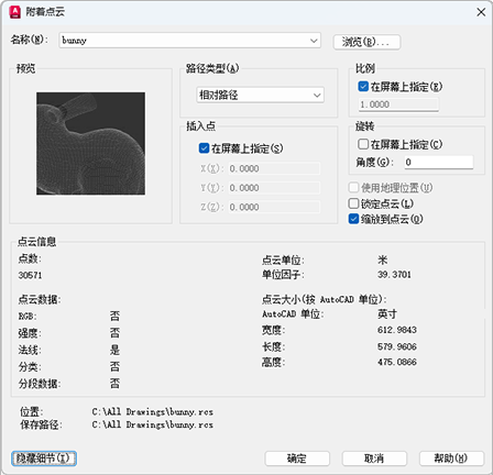 - 在“附着点云”对话框中,指定您偏好的插入点、比例和旋转角度。