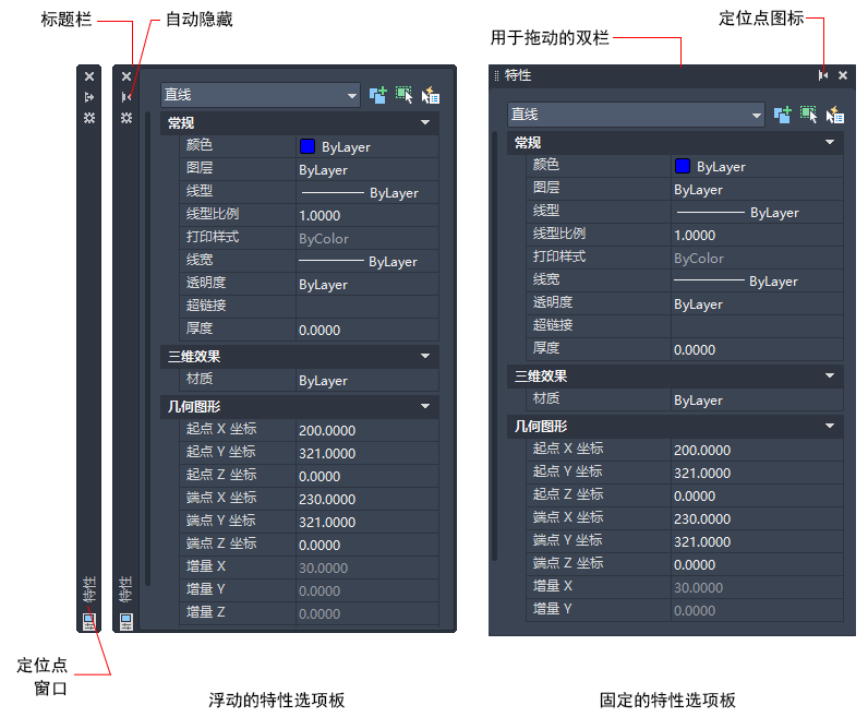 功能区、特性选项板、工具选项板、命令窗口和设计中心等窗口均可固定、定位或浮动。在快捷菜单(通过在选项板或窗口的标题栏上单击鼠标右键来访问)中,经常会更改这些选项以及其他选项的设置。