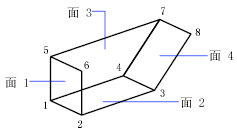 在图中,面 1 由顶点 1、5、6 和 2 定义。面 2 由顶点 1、4、3 和 2 定义。面 3 由顶点 1、4、7 和 5 定义,面 4 由顶点 3、4、7 和 8 定义。